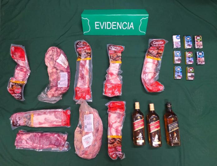 Durante el procedimiento, el personal policial recuperó diversas especies asociadas al robo, entre ellas costillares de cerdo, carne de vacuno, botellas de whisky y cajetillas de cigarrillos. Asimismo, se procedió a la incautación de un vehículo presuntamente utilizado para la comisión del ilícito.