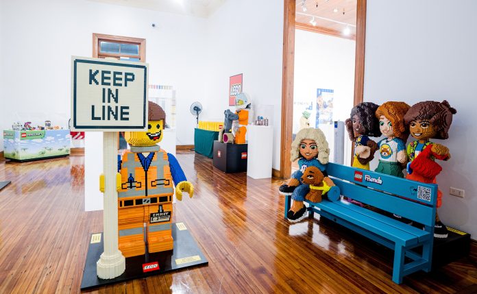 La exposición ofrece un recorrido visual que incluye figuras botánicas, vehículos y personajes de ficción del cine y la televisión, además de construcciones clásicas que destacan la historia y creatividad asociada a la marca.