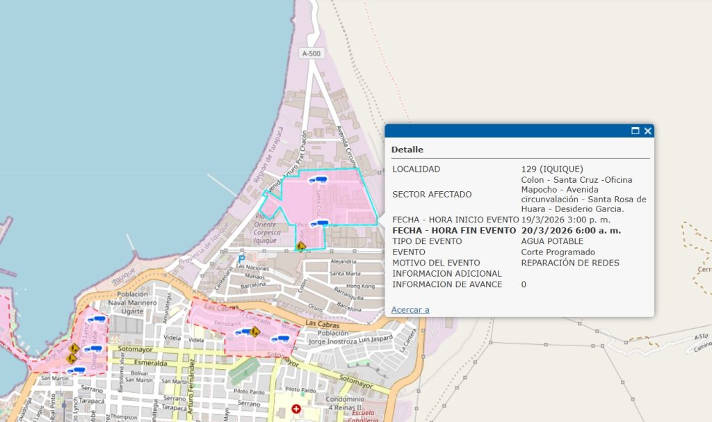 El corte programado afectará al cuadrante conformado por avenida calle Colón, Santa Cruz, Oficina Mapocho, avenida Circunvalación, Santa Rosa de Huara y Desiderio García.