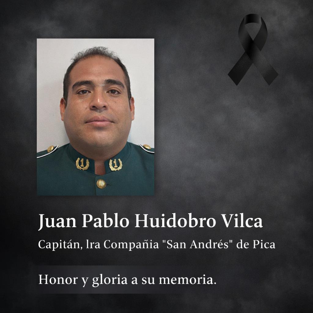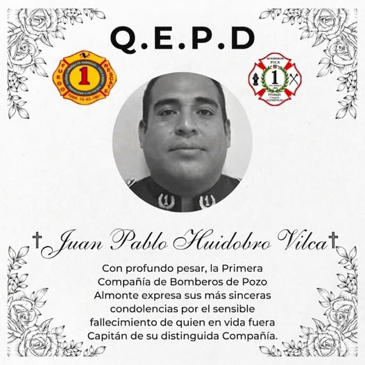 De igual forma, la Primera Compañía de Bomberos de Pozo Almonte expresó extendió su “más profundo y fraternal abrazo de condolencias ante la irreparable partida de quien fuera el Capitán de la Primera Compañía de Pica, Juan Pablo Huidobro Vilca”.
