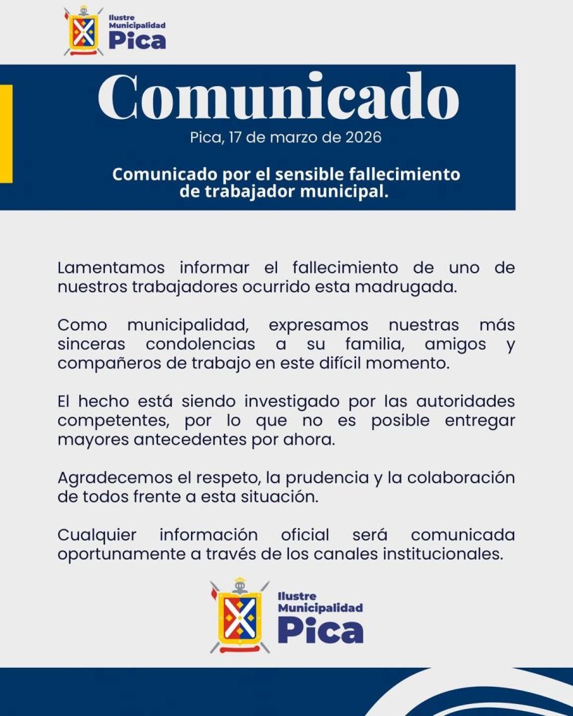 La Municipalidad de Pica informó el sensible fallecimiento del funcionario municipal y capitán de la Primera Compañía de Bomberos de San Andrés de Pica, Juan Huidobro Vilca, ocurrido durante la madrugada de este martes.