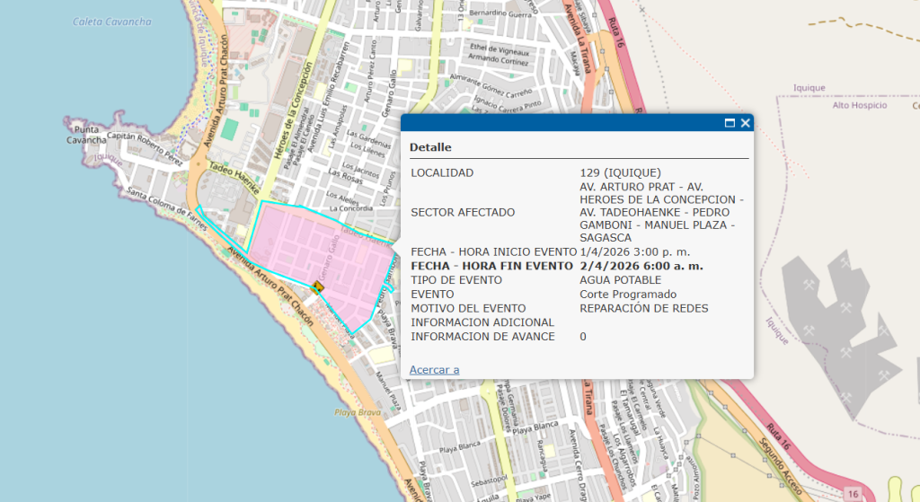La empresa Aguas del Altiplano informó que esta semana realizará un corte programado en el sector costero de la ciudad de Iquique, debido a trabajos para la reparación de redes.