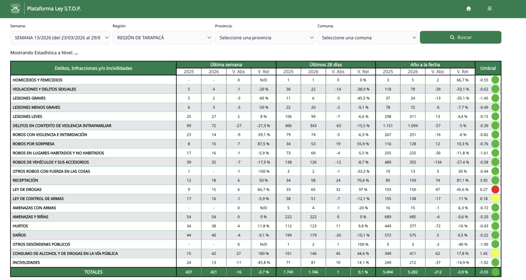 Las cifras de la semana 13 del sistema STOP de Carabineros de Chile muestran una disminución general de 3,9% en los delitos e incivilidades en la Región de Tarapacá durante 2026, en comparación con igual período del año pasado.