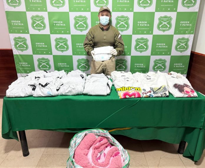 Una mujer fue detenida por Carabineros del OS7 Iquique durante un servicio preventivo realizado en la provincia del Tamarugal, tras ser sorprendida transportando más de 22 kilos de droga impregnada en diversas prendas de vestir que llevaba al interior de dos bolsos.