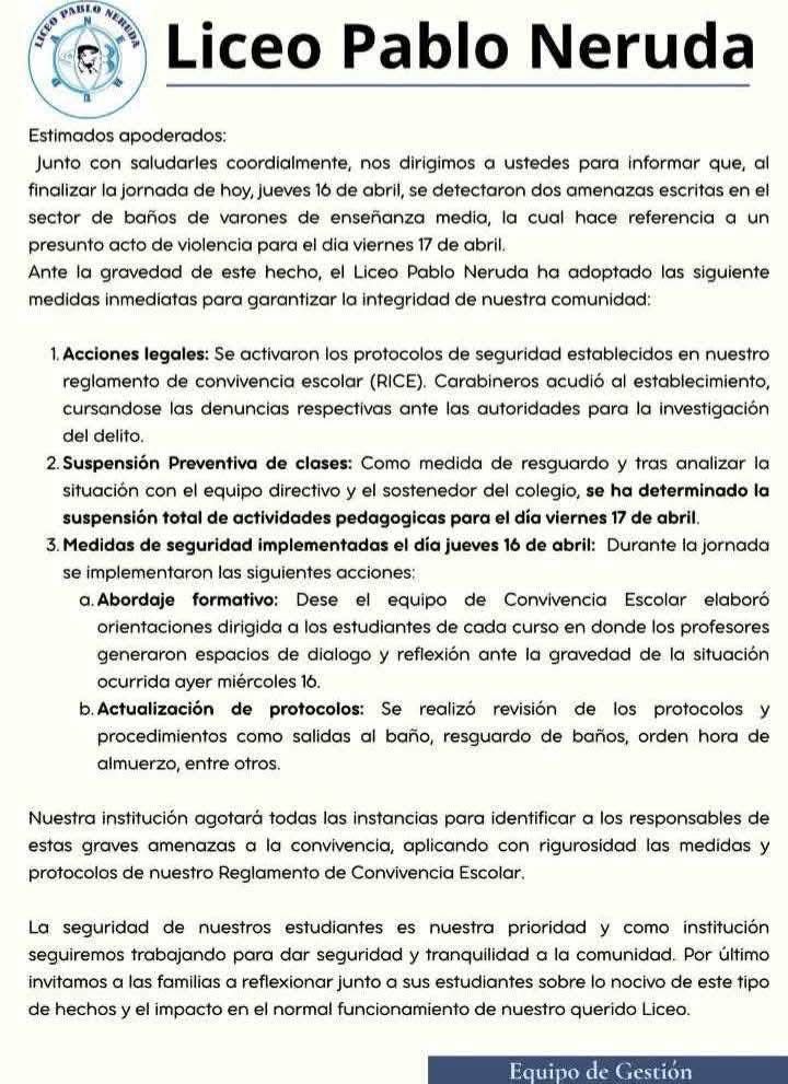 Por su parte, el Liceo Pablo Neruda informó que al finalizar la jornada del jueves, se detectaron dos amenazas escritas en el sector de baños de varones de enseñanza media, la cual hace referencia a un “presunto acto de violencia” para este viernes.