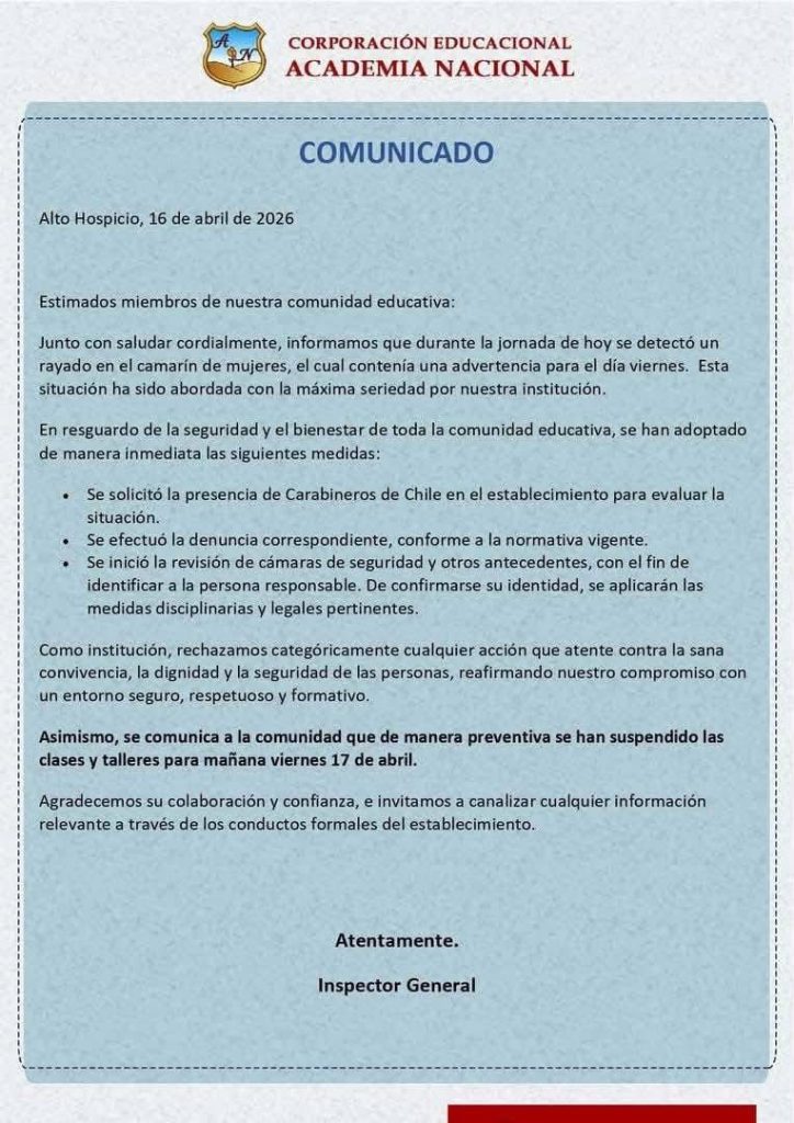 En un comunicado dirigido a la comunidad educativa, la Academia Nacional indicó que el jueves 16 de abril se detectó un rayado en el camarín de mujeres, el cual contenía una “advertencia” para este viernes.