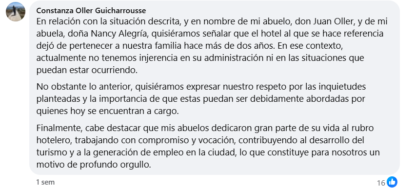La crisis en el Gavina Costa Mar también resonó entre quienes construyeron el establecimiento desde sus cimientos. El 7 de abril de 2026, en el hilo de comentarios de una publicación que circuló en la página de Facebook “Emergencias Iquique“, Constanza Oller Guicharrousse tomó la palabra para desvincular públicamente a su familia de la situación actual. En nombre de su abuelo, don Juan Oller —el empresario que fundó el hotel en 1993 en los terrenos conocidos como los Baños de Gaviota y que lo bautizó Gavina, que significa gaviota en catalán—, y de su abuela, doña Nancy Alegría, la nieta señaló que el hotel dejó de pertenecer a la familia hace más de dos años y que, en consecuencia, no tienen injerencia alguna en su administración ni en las situaciones que puedan estar ocurriendo.